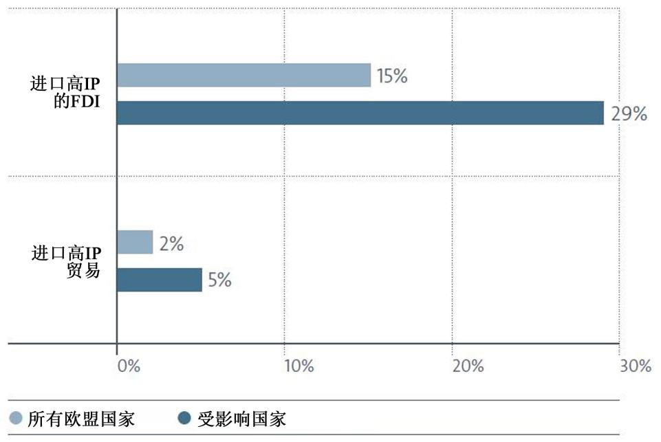 与其他行业相比较,欧洲单一市场中分析仪器、生物制药、化学品、信息和通信技术、医疗器械和生产技术等高IP行业在欧盟的出口贸易和外国直接投资(FDI)中所占的比重,要大于其在进口贸易、区域内贸易、以及成员国之间相互投资中所占的比重。同时,高IP行业的贸易和外国直接投资(FDI)量对于欧盟各国的专利保护程度尤其敏感。