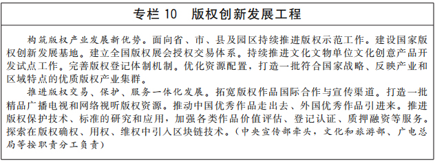 ——知识产权运用取得新成效。知识产权转移转化体制机制更加完善,知识产权归属制度更加健全,知识产权流转更加顺畅,知识产权转化效益显著提高,知识产权市场价值进一步凸显,专利密集型产业增加值和版权产业增加值占GDP比重稳步提升,推动产业转型升级和新兴产业创新发展。