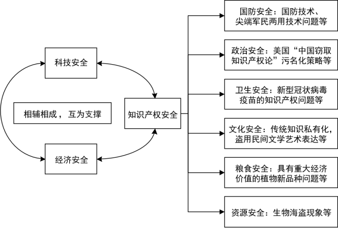 综上,知识产权制度激励了科技创新,科技创新的成果通过知识产权得以运用、保护,获取的经济利益又保证了新一轮的研发投入,从而产生新的技术成果。可见,知识产权安全是这一循环的关键要素。除此之外,知识产权安全还与国家文化安全、卫生安全、国防安全、粮食安全乃至政治安全存在联系(具体联系如图1所示)。
