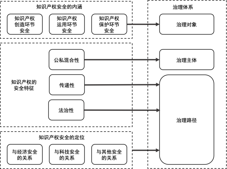 知识产权安全的内涵、特征及定位综合回应了治理对象、治理主体与治理路径等问题,是构建知识产权安全治理体系的基础。其对应关系如图2所示。