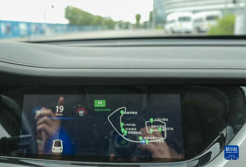 一辆L4级自动驾驶汽车在自动驾驶模式下,沿着重庆仙桃国际大数据谷示范运营线路的开放城市道路进行自动驾驶模式行驶测试(2019年7月24日摄)。新华社记者 刘潺 摄