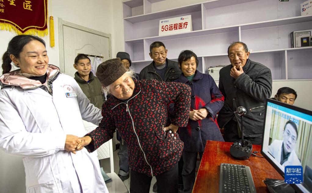 安徽省金寨县大湾村村民方临芳(前左二)指着自己身体疼痛的部位,在村医袁玲(左一)的帮助下向5G远程医疗会诊的专家讲述病情(2020年12月3日摄)。新华社发(陈力 摄)