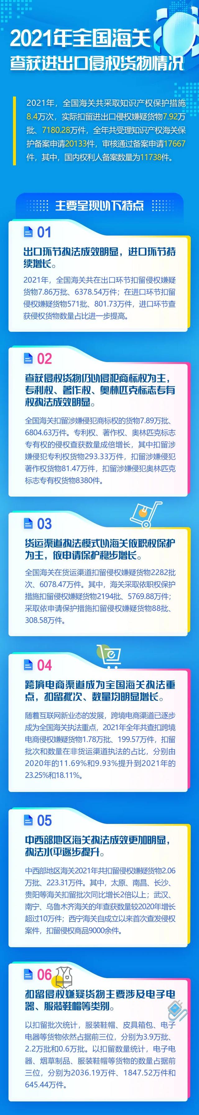保持打击进出口侵权商品高压态势。2021年,海关总署连续第5年部署开展“龙腾行动”,全国海关持续聚焦群众反映强烈、社会舆论关注、侵权假冒多发的重点商品,尤其对进出口关乎生命健康、威胁公众安全的侵权商品的行为实施重拳打击。上海、南京、宁波等海关扣留侵权糖果、番茄酱、饮料等198.9万件,坚决守护消费者“舌尖上的安全”;厦门、汕头、昆明等海关加强对“贴身”产品的知识产权保护力度,扣留侵权卫生巾、洗发水、化妆棉等个人护理用品582.2万件;天津、拉萨等海关重点关注儿童用品安全,扣留侵权童装、童车、玩具等近90万件;杭州、青岛、黄埔等海关开展假冒汽车零配件专项执法,扣留侵权发动机零件、滤清器、雨刷等58.8万余件。