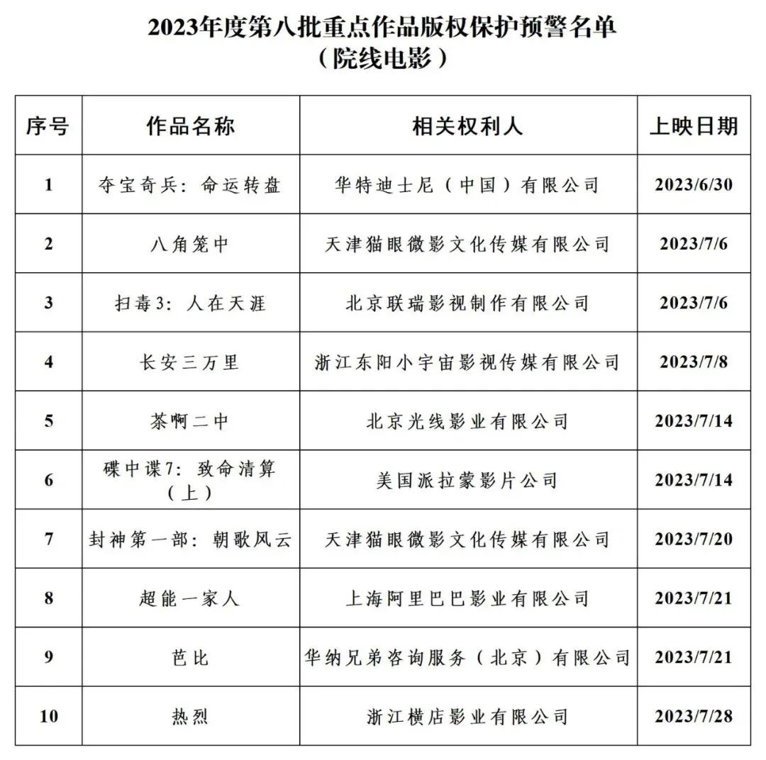 按照国家版权局《关于开展院线电影版权保护专项工作的通知》《关于进一步加强互联网传播作品版权监管工作的意见》及版权重点监管工作计划,根据相关权利人上报的作品授权情况,现公布2023年度第八批重点作品版权保护预警名单。